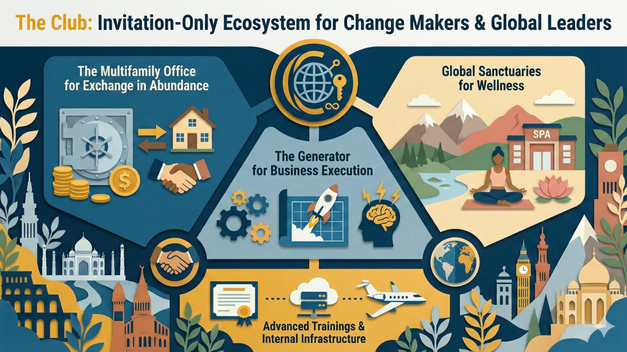 The Club is an invitation-only ecosystem for Change Makers and Global Leaders. Our membership-based private club includes our advanced courses and access to our internal infrastructure: The Multifamily Office for Exchange in Abundance, The Generator for business execution, and Global Sanctuaries for wellness.
